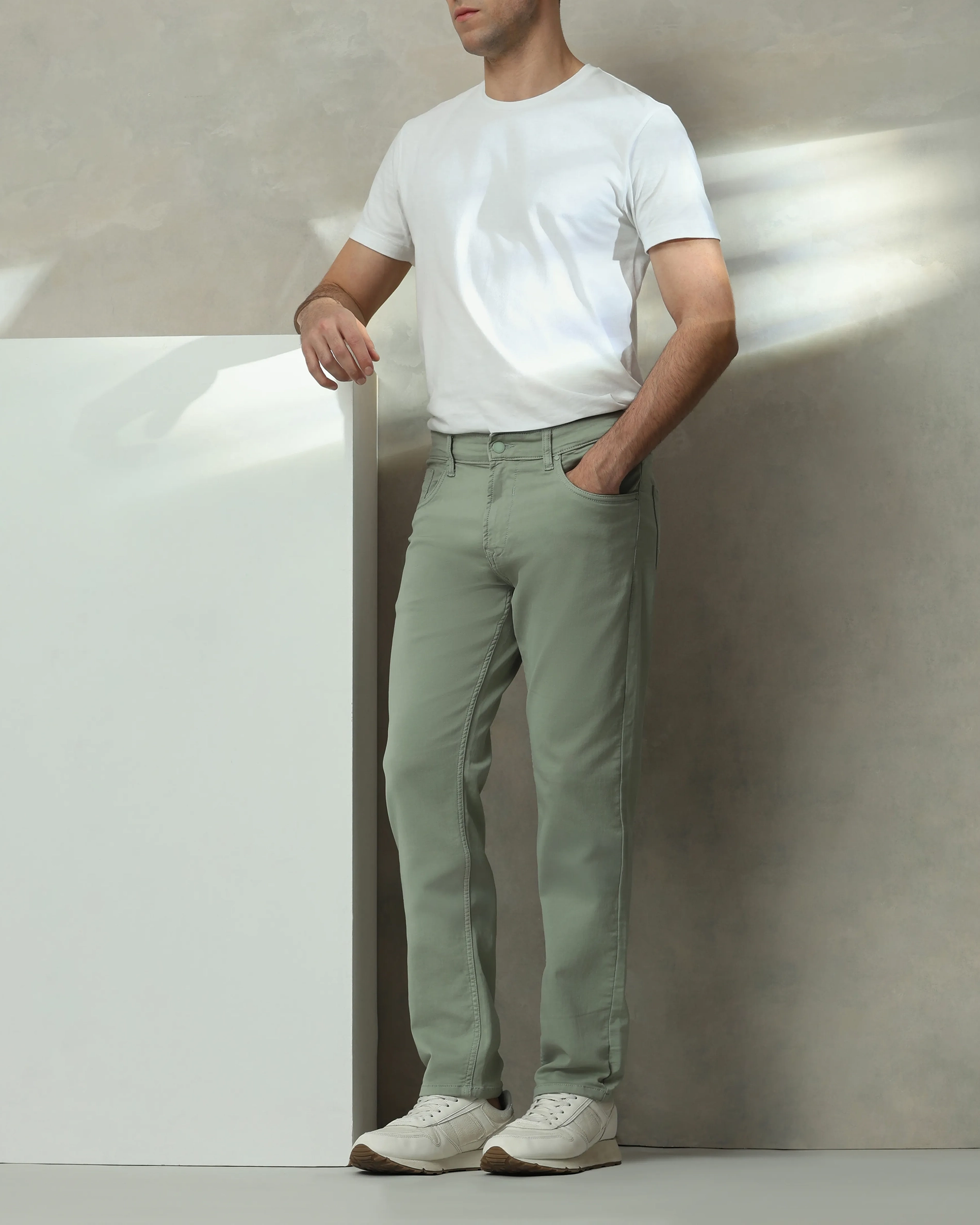 Infuse Subtle Sophistication Into Your Wardrobe With Lightweight Sage Superstretch Coloured Straight Fit Jeans. Constructed From A Comfortable And Flexible Cotton-Polyester-Elastane Blend (85% Cotton, 13% Polyester, 2% Elastane) In A Dobby Weave, These Lightweight Jeans Are Designed For All-Day Wear. Featuring A Mid-Rise And A Straight Fit Silhouette That Tapers At The Bottom, They Provide Ease At The Thigh, Hip, And Seat For A Relaxed Yet Polished Look. The Classic 5-Pocket Design Adds Utility, Making Them A Staple For Pairing With Smart Casual Shirts Or Relaxed T-Shirts. Care Instructions: Cold Water Machine Wash Inside Out, Flat Dry In Shade, And Light Iron Only.