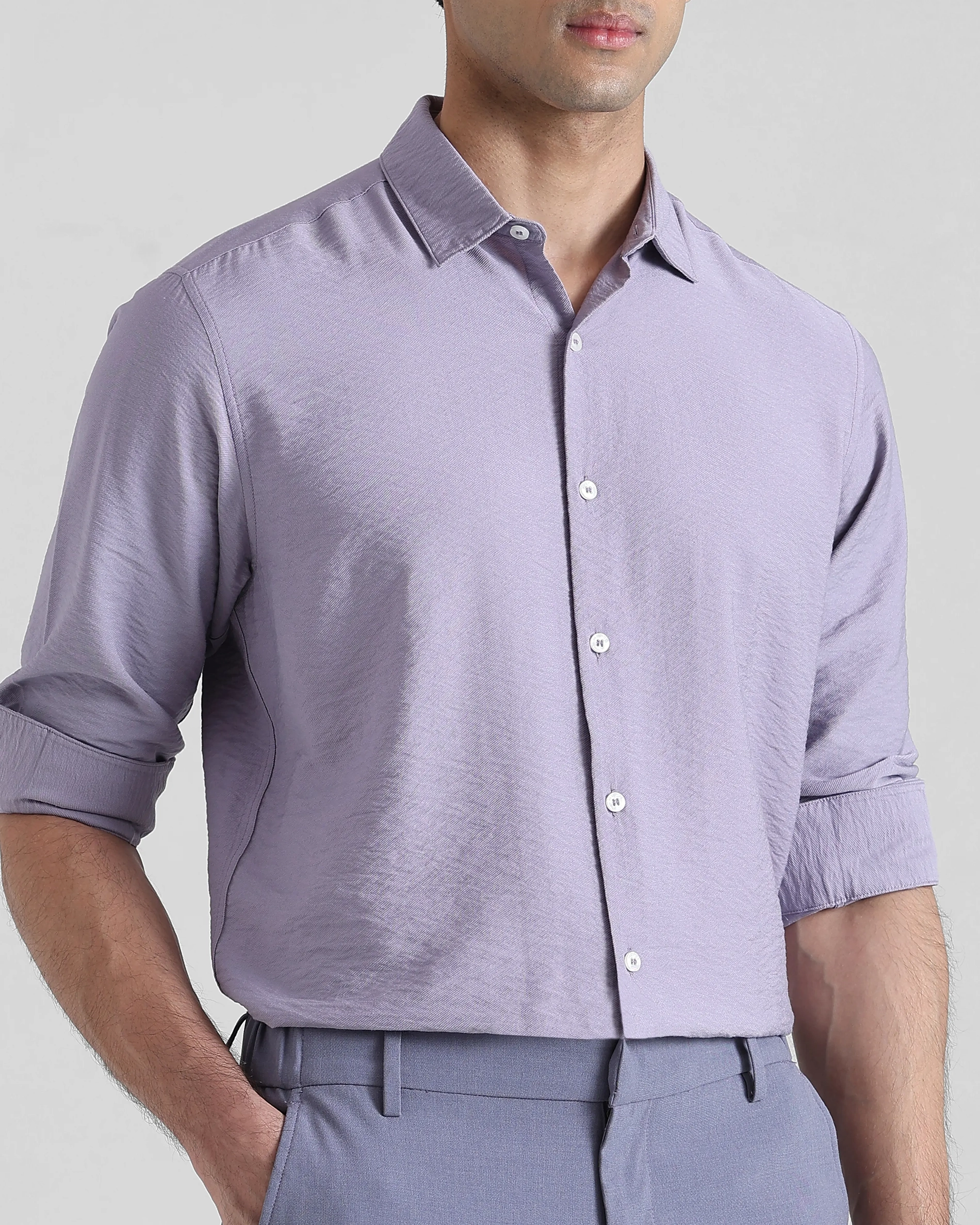 Step into pastels with confidence. This lilac full-sleeve shirt is crafted from a soft viscose-nylon blend with a distinctive texture, offering a fresh approach to everyday dressing. The slim fit enhances its structured yet comfortable feel, while the spread collar lends a polished finish. Pair it with neutrals or go tonal for a statement look.
